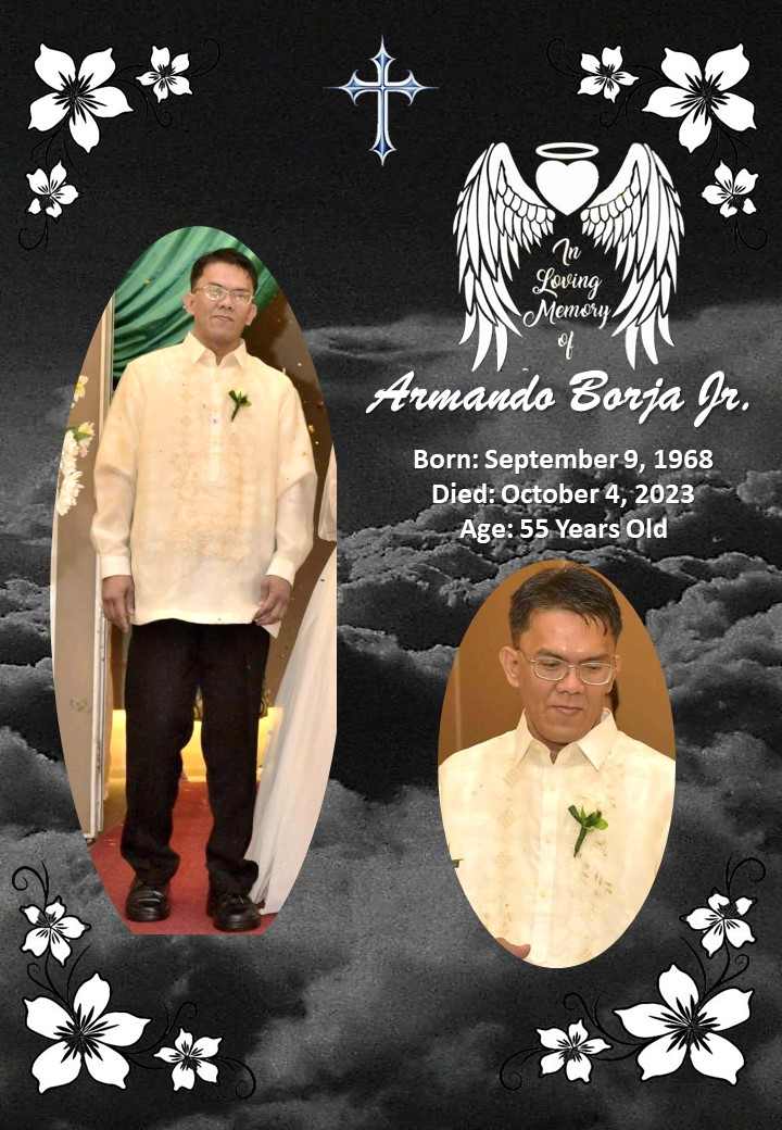 Armando Monter Borja Jr., age 55, of Manila City passed away on October 4, 2023. Armando was born on September 9, 1968, to Mrs. Epifania Borja and Mr. Armando Borja.